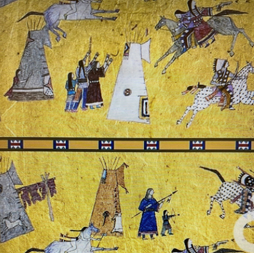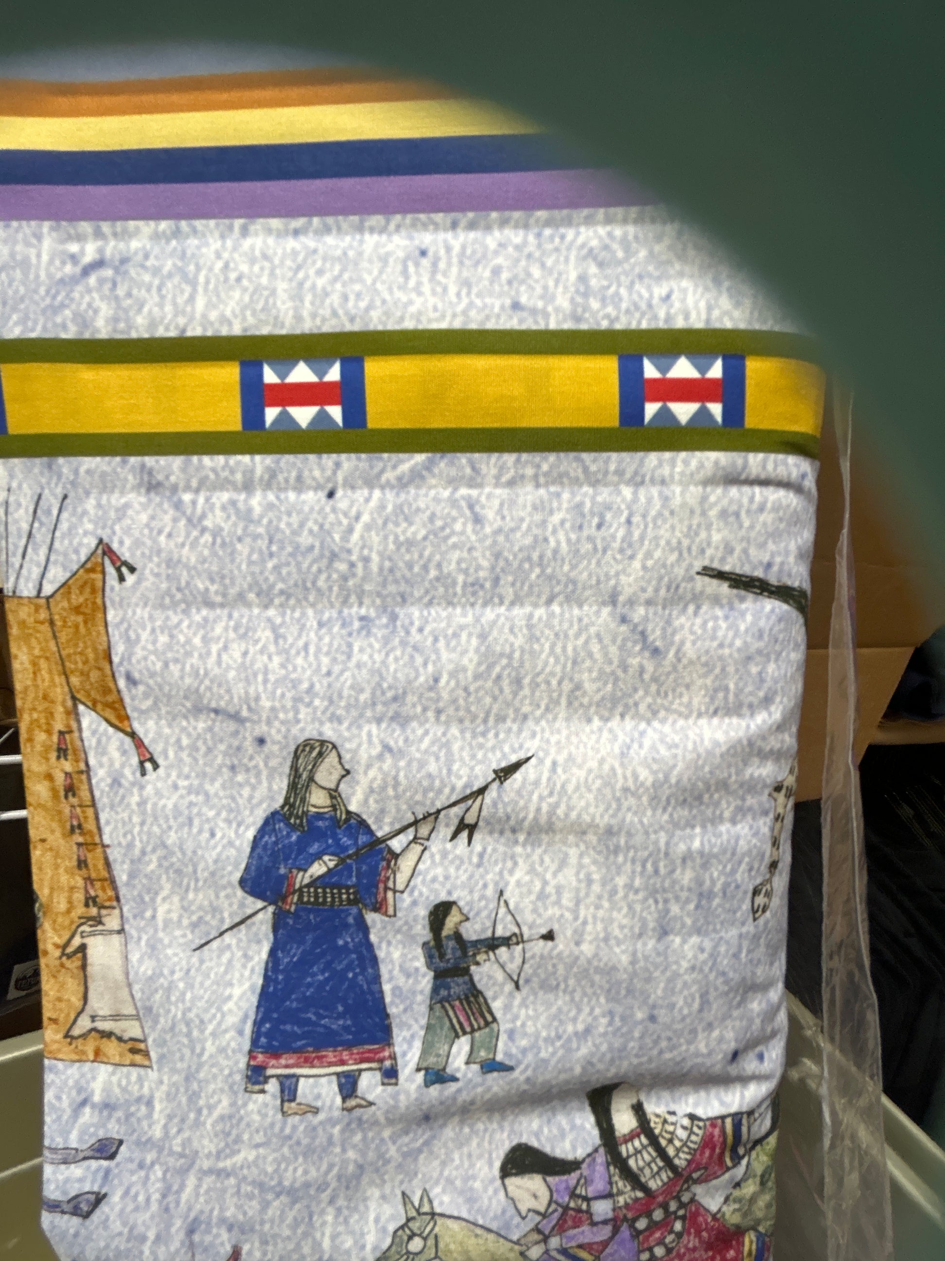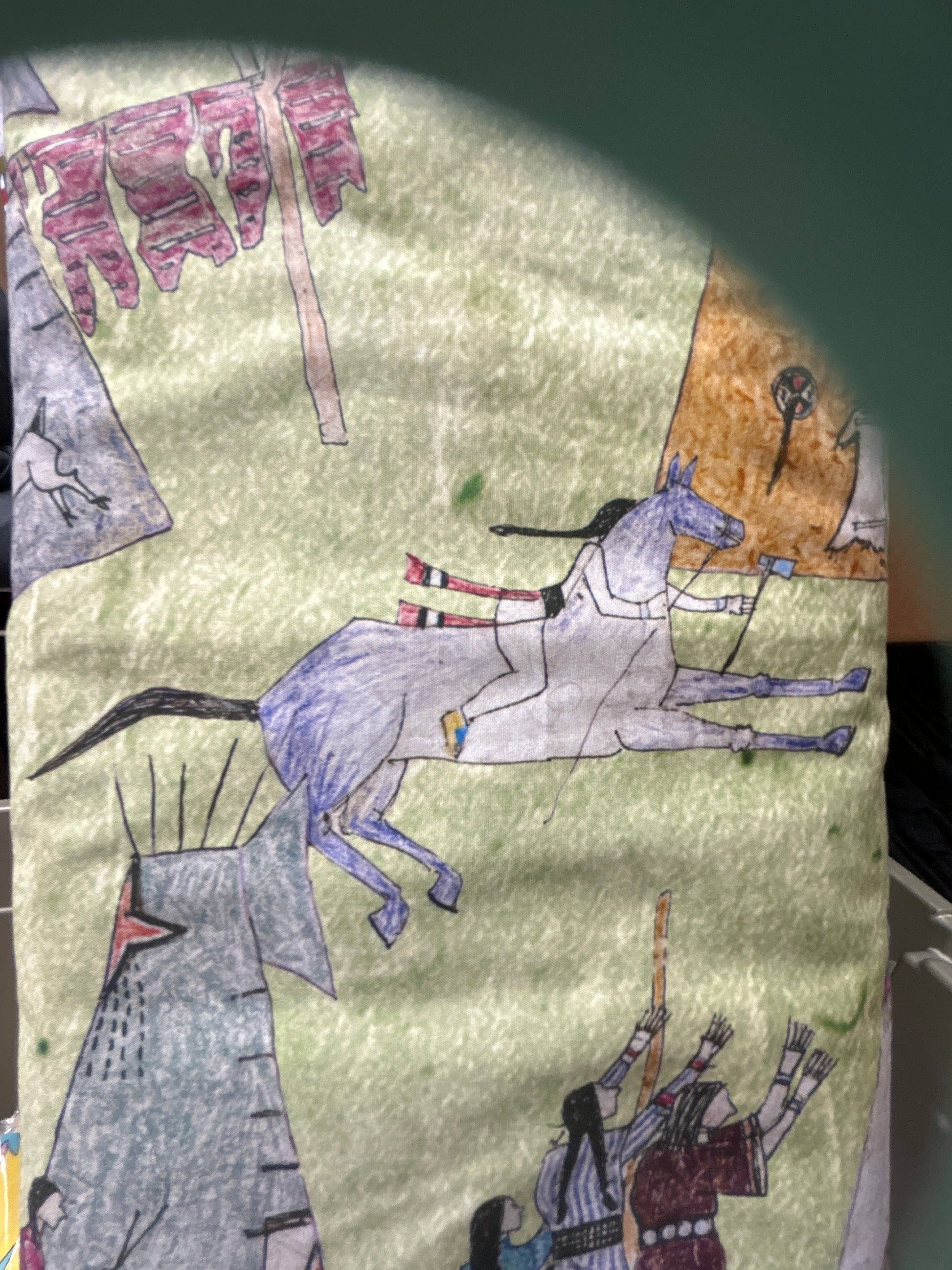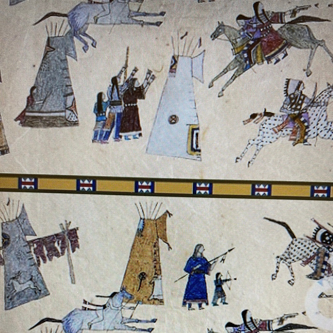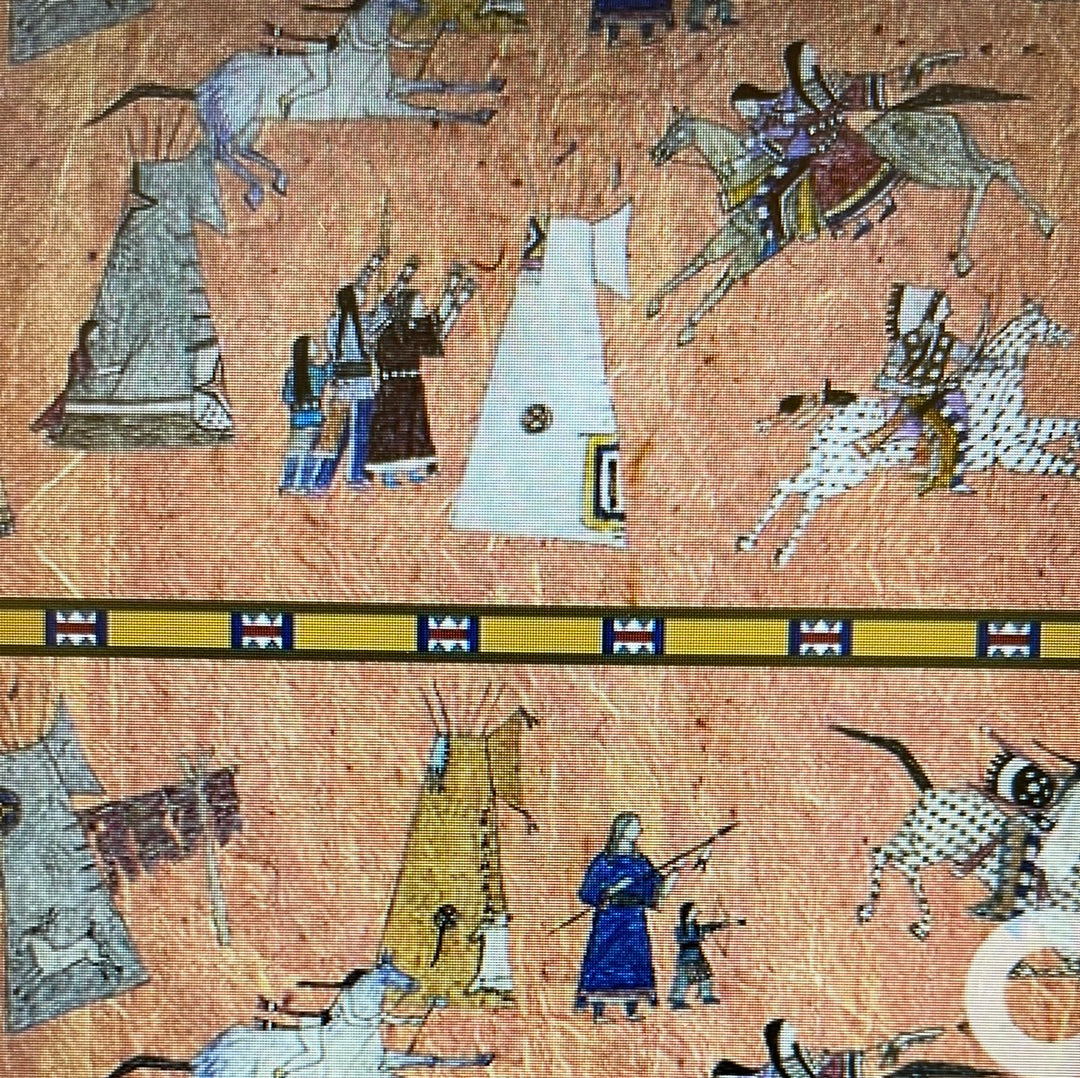 The Girl Who Saved Her Brother cotton fabric featuring original ledger art on handmade paper by Dr. Thomas Red Owl Haukaas.