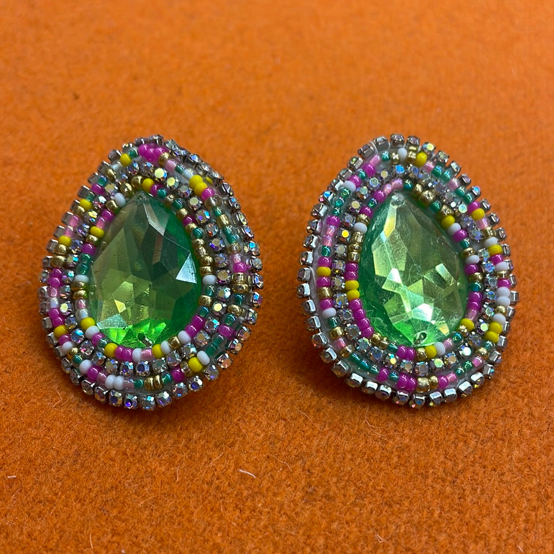 Green Beaded Cabachon Earrings