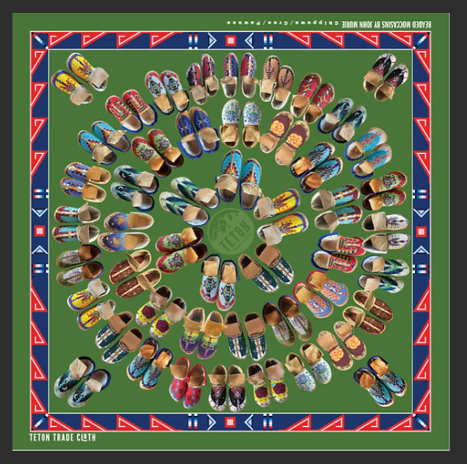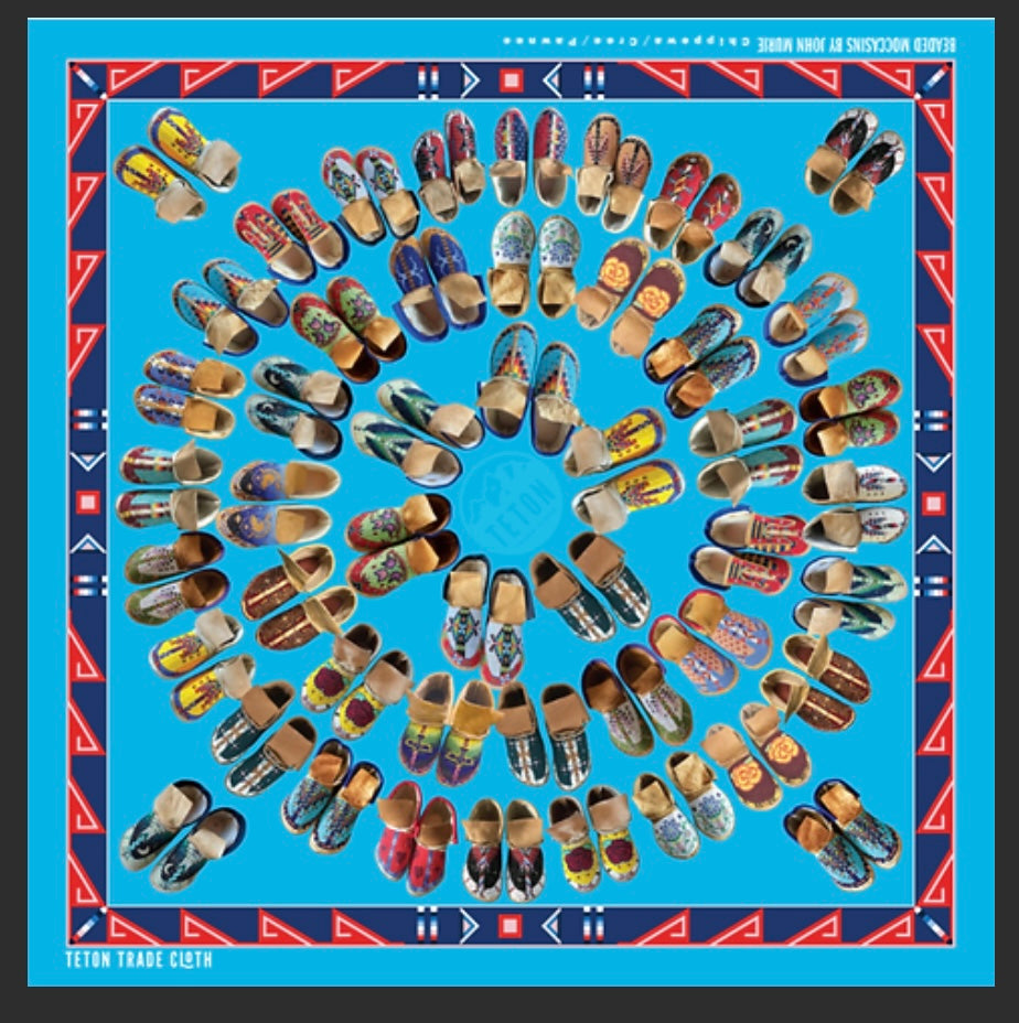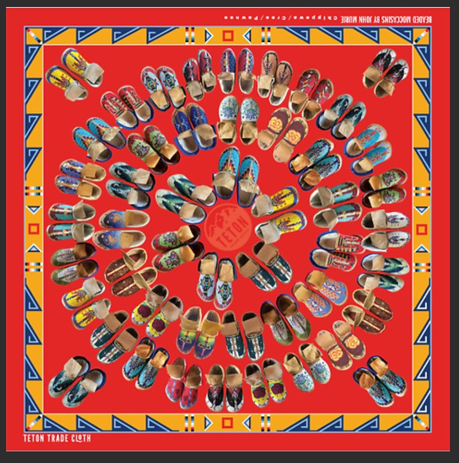 These amazing bandanas feature high resolution images of moccasins beaded and created by the world famous John Murie.