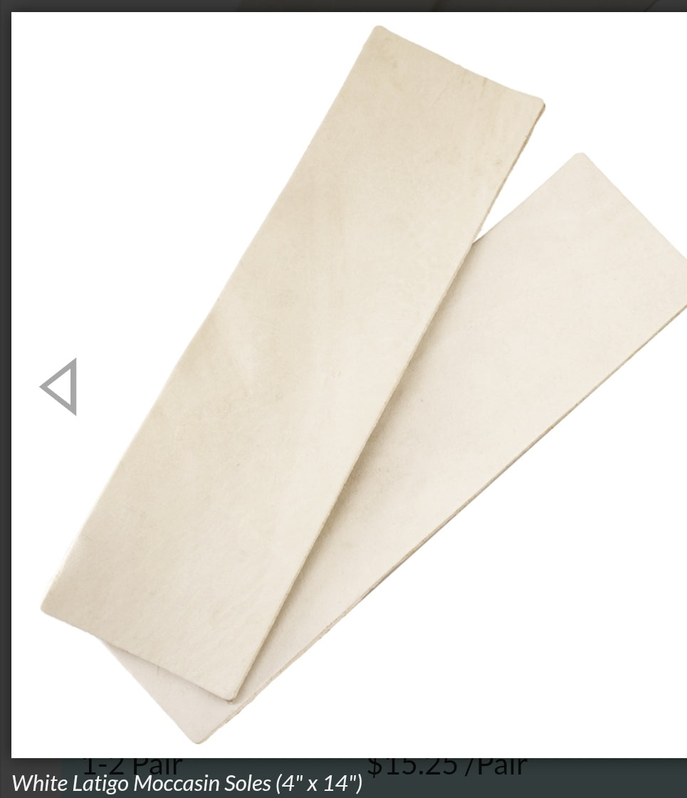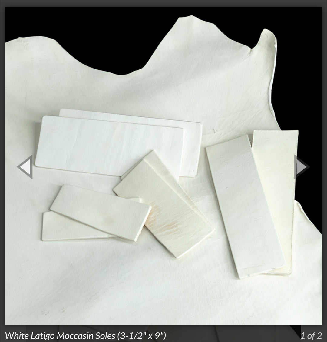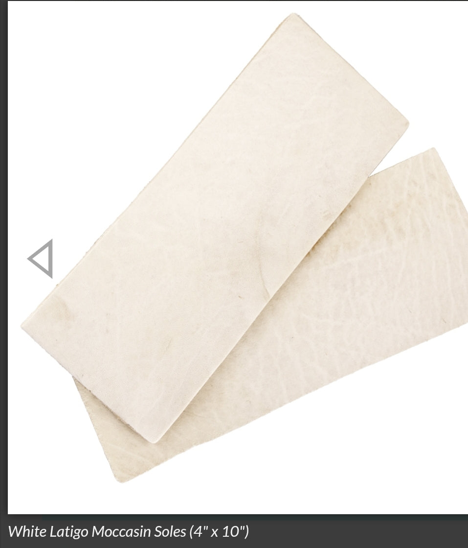 Heavy White Latigo Moccasin Soles, made of leather approx 1/8"-1/4" thick. This white latigo leather is flexible for easy turning after sewing to the upper. These White Latigo Moccasin Soles are tough and long wearing. They are the best product available for moccasin soles. Available in 5 sizes (see related items below). Sold by the pair.
