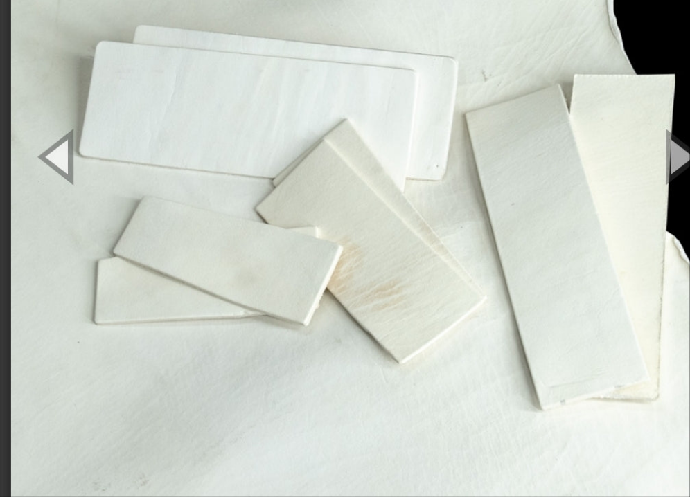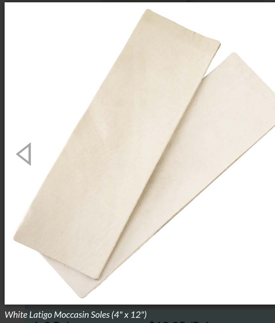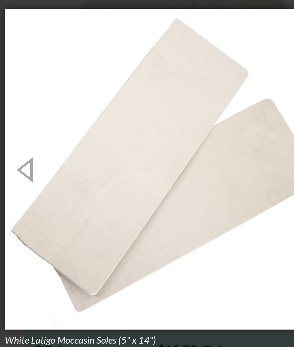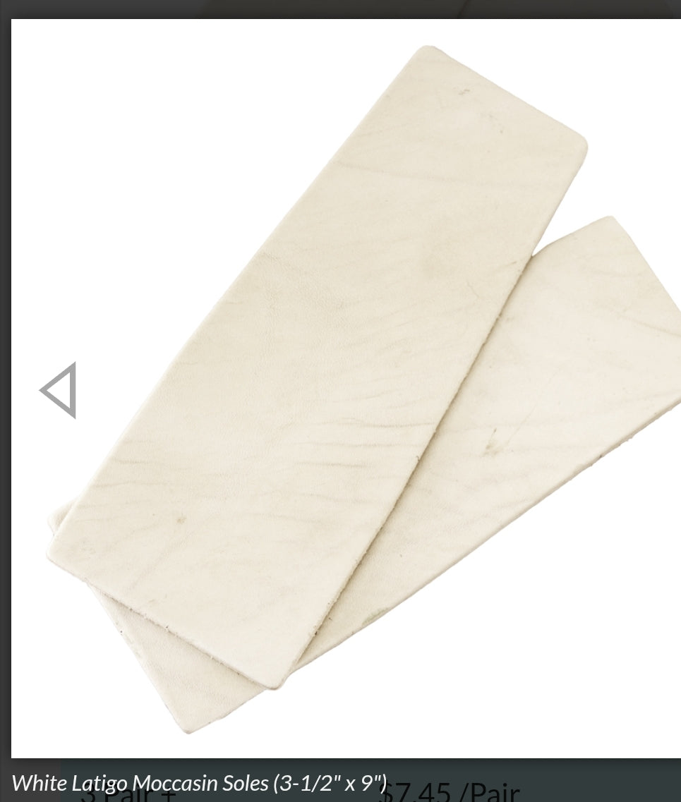 Heavy White Latigo Moccasin Soles, made of leather approx 1/8"-1/4" thick. This white latigo leather is flexible for easy turning after sewing to the upper. These White Latigo Moccasin Soles are tough and long wearing. They are the best product available for moccasin soles. Available in 5 sizes (see related items below). Sold by the pair.