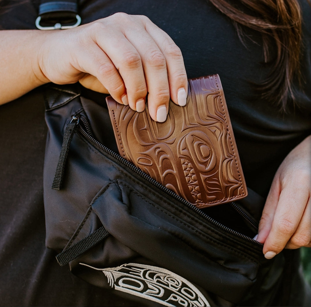 Leather Embossed Wallets are made with genuine 100% leather with polyester lining. Their refined full-panel embossed Indigenous artwork mixed with RFID protection provides extra safety and outstanding style. Each wallet comes individually packaged in a gift box.