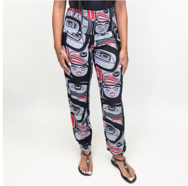 Comfy pants are perfect for lounging at home or running quick errands around town. Known by many as the "perfect pajama pants" these fashion-forward Indigenous patterns are ready to catch the eye of onlookers when worn outside the home. Experience comfort at its finest with the combination of a smocked waist and soft breathable fabric.