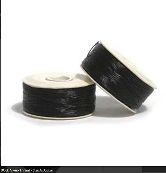 Black Nymo Thread - Size A Bobbin: Nymo thread is best for gourd stitch, earrings, lazy stitch, applique and weft threads for loomwork. For warp threads, we recommend cotton as it does not stretch like Nymo. Use quilting thread for 12/0 and smaller, and button & carpet for 10/0 and 11/0. Nymo can be used for warp threads, too, but it should be pre-stretched before use, even for gourd or lazy stitch. Thread should be coated with beeswax during use as this helps prevent tangling and prolongs the life of the thread.