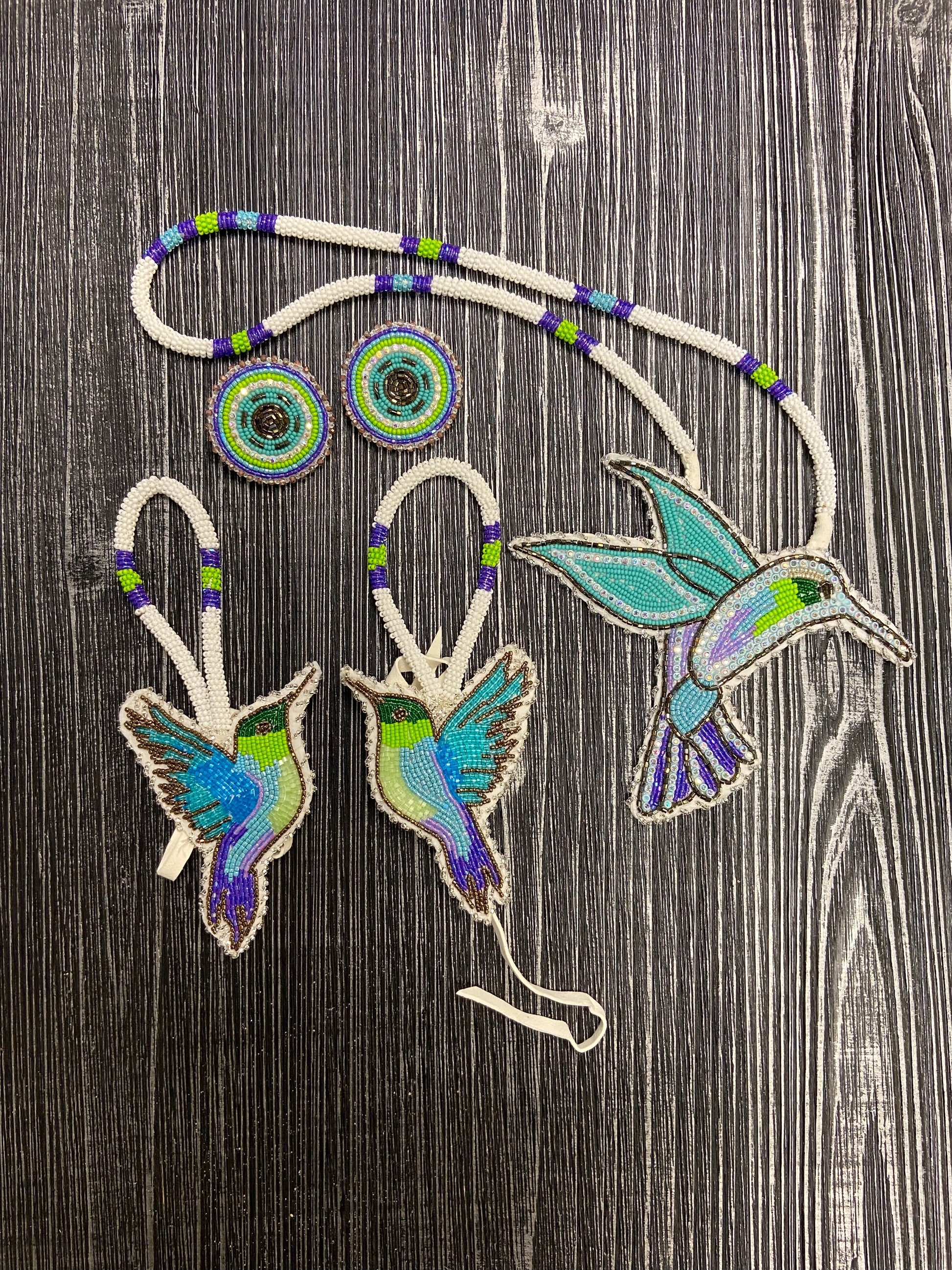 Fully beaded set. Hummingbirds. Necklace, hair ties, earrings.