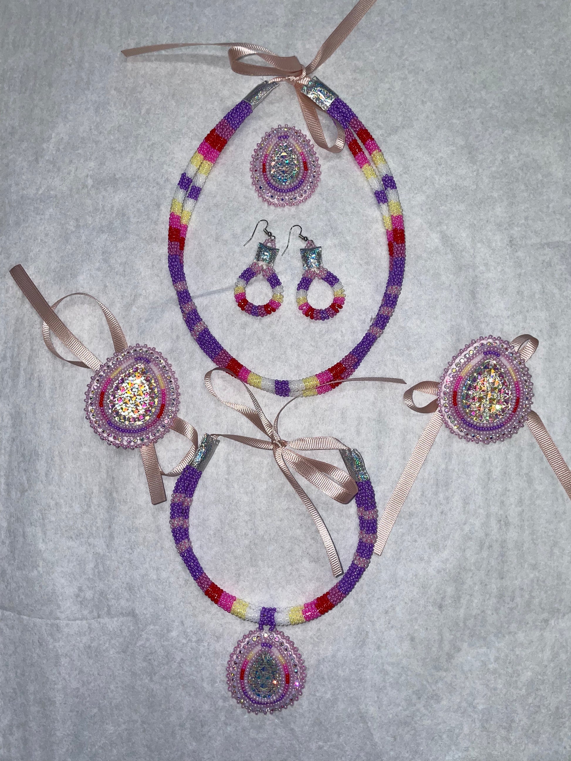 Necklace, choker with drop, hair ties, earrings, and barrette.