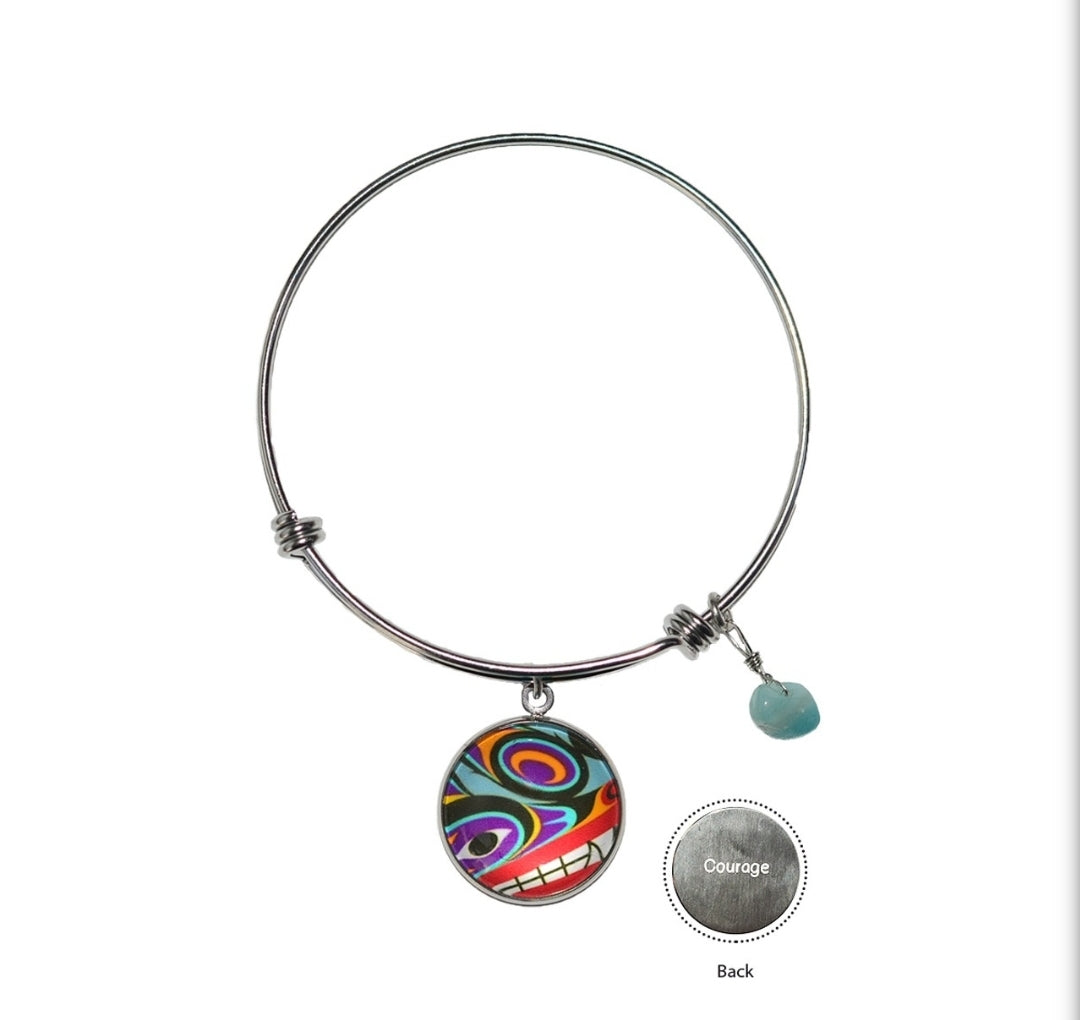 Sleek and elegant, these Circle Charm Bangles feature beautiful artwork by Indigenous artists. Crafted in polished stainless steel with one genuine semi-precious stone detail and an inspirational word engraved on the back of each charm.