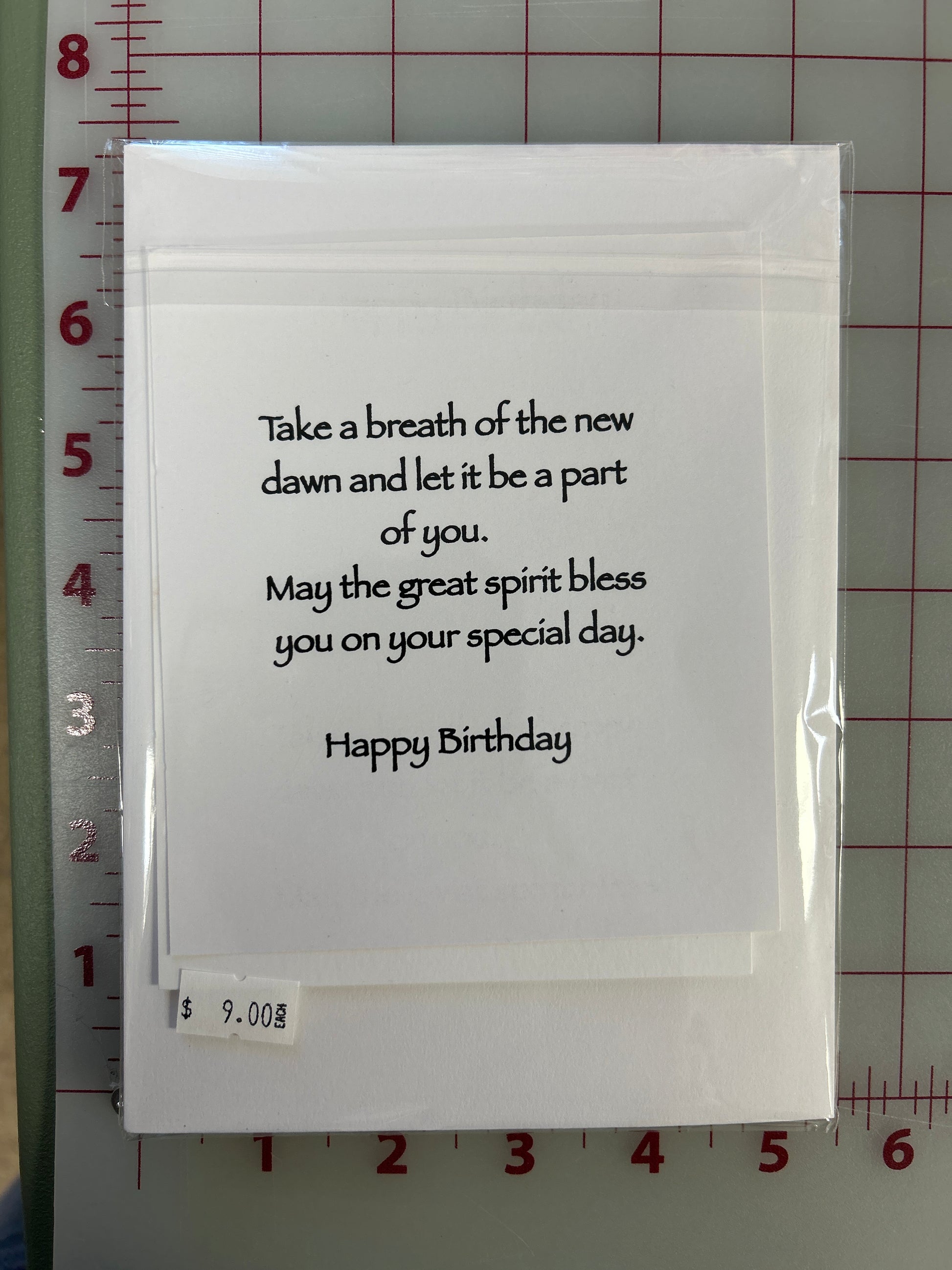 Wëlí katënamí (on front) Take a breath of new dawn and let it be a part of you. May the great spirit bless you on your special day. Happy Birthday ( inside card )