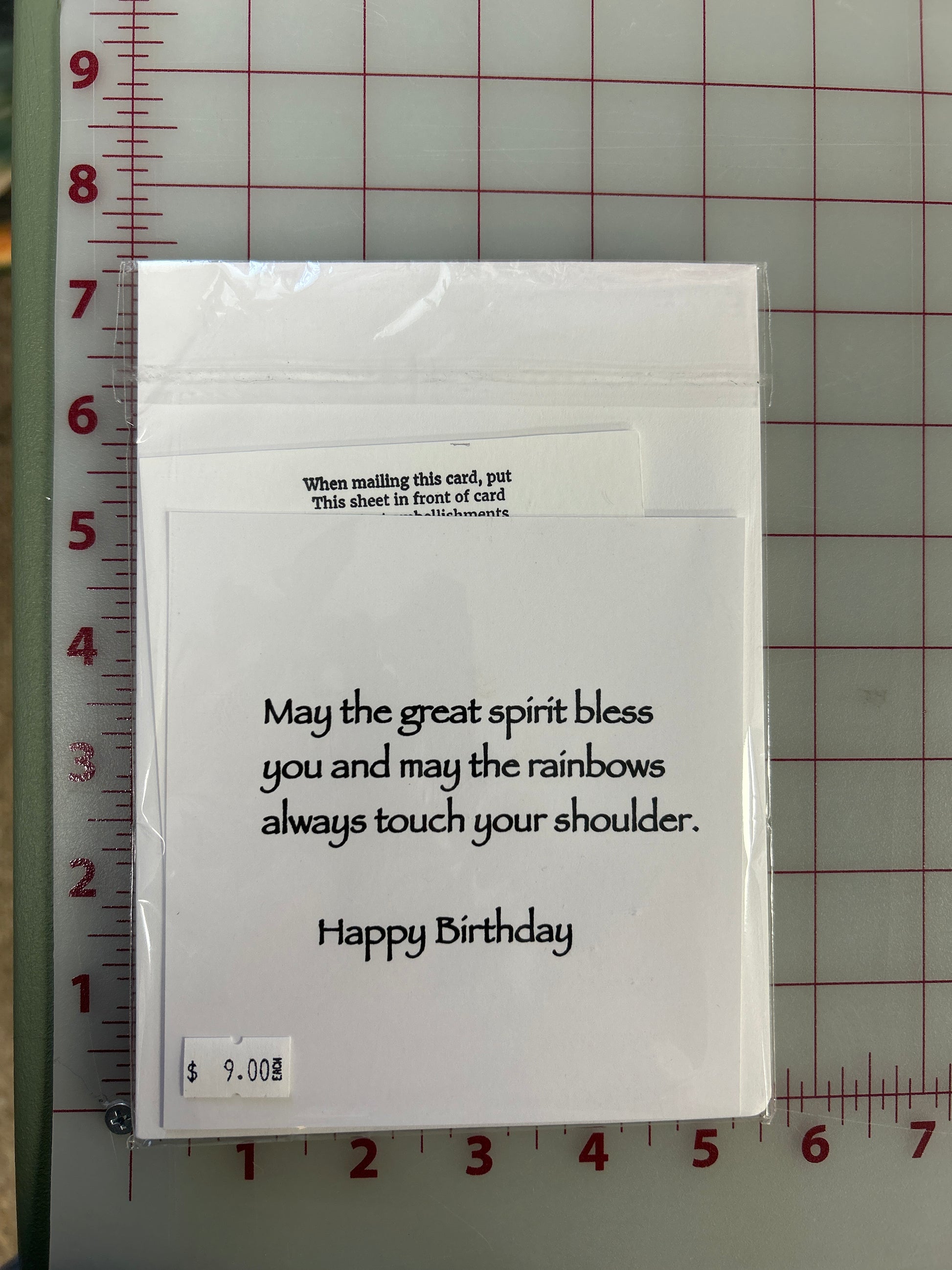 Wëlí katënamí (on front) May the great spirit bless you and may the rainbows always touch your shoulder. Happy Birthday ( inside card)