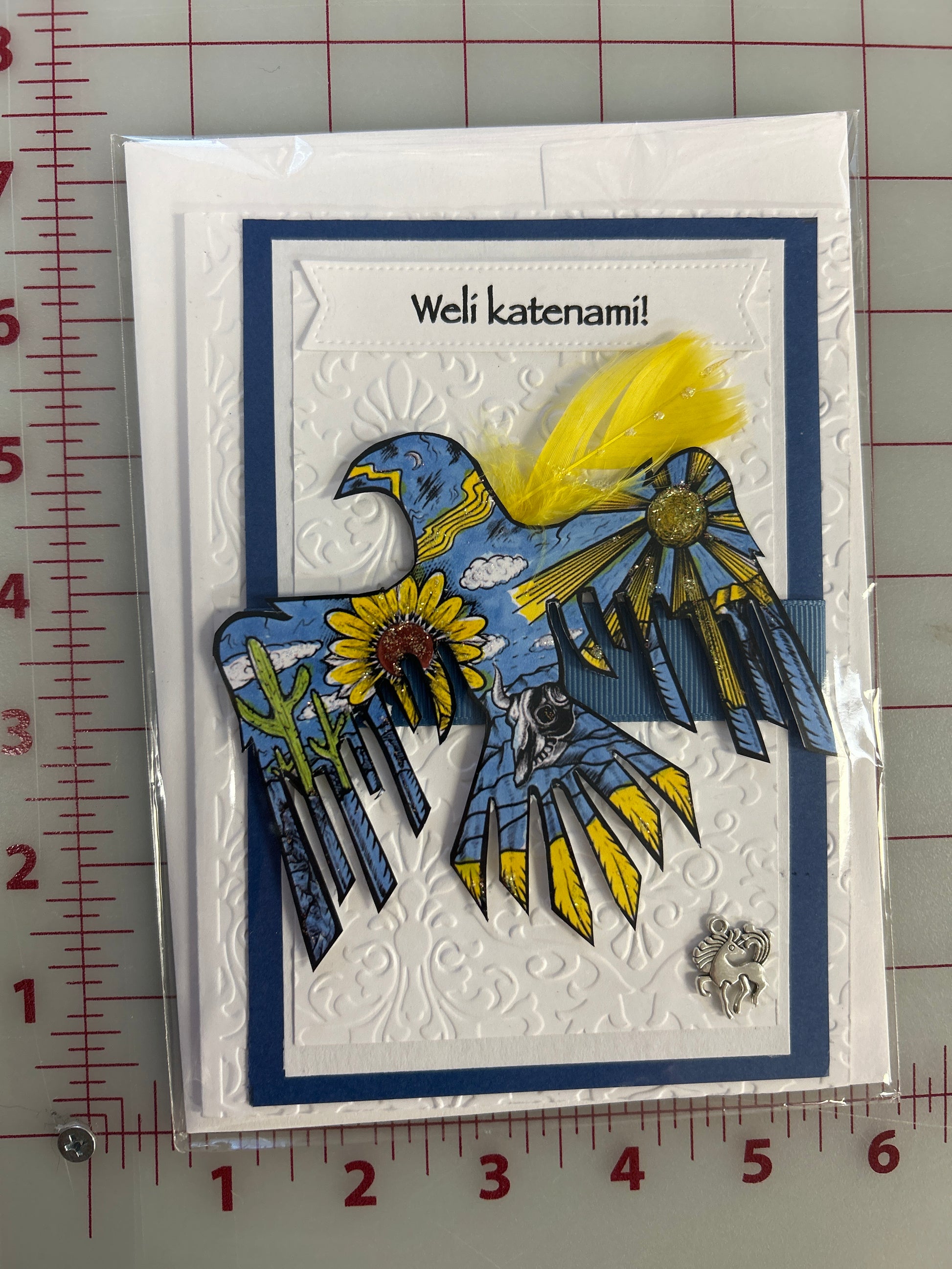 Wëlí katënamí Happy Birthday Card “Yellow Feather/Blue Bird”