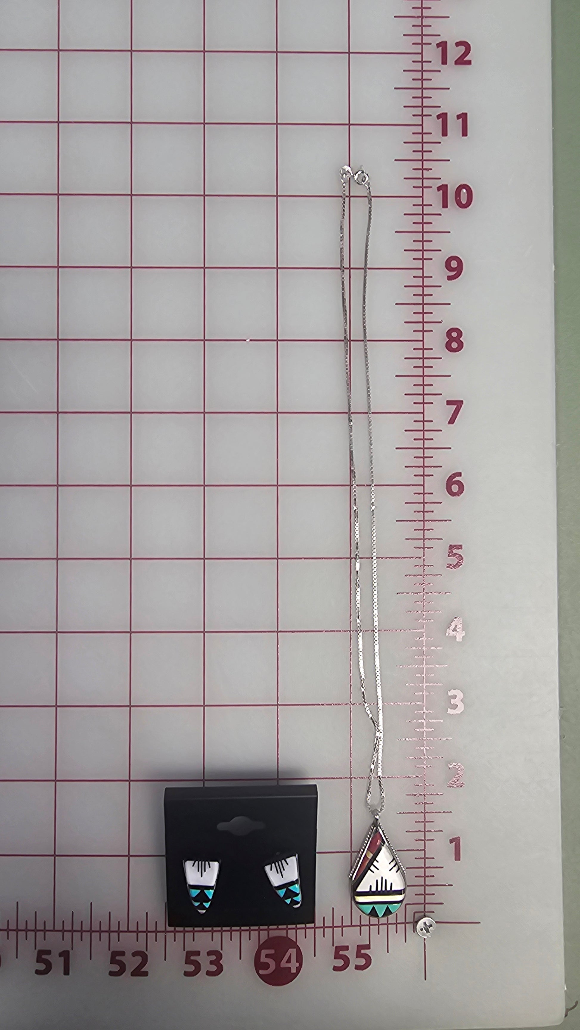 Zuni set. Teardrop pendant size 1.5 inch length. Post back earrings .75 inch length. Chain included.